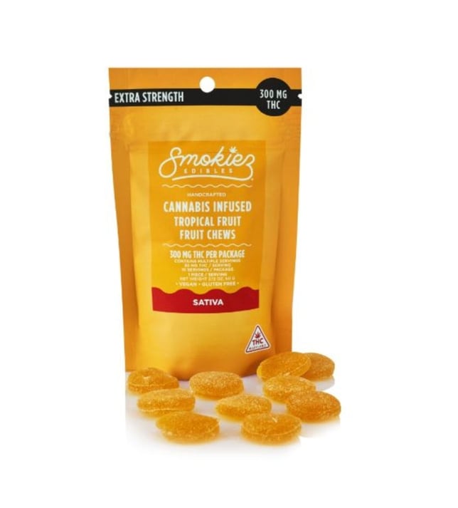 Now enhanced with cannabis terpenes! Smokiez Tropical Fruit Chews are NOT YOUR AVERAGE FRUIT CHEWS™. These fruit chews taste like a mesh of tart tropical fruits, with a tangy balance of fruity and citrusy notes. They are also Vegan, Gluten Free, Dairy-Free, and contain NO High Fructose Corn Syrup. Each of our mouth watering fruit chews contain 30 mg of THC, and made with our high clarity cannabis distillate for great taste. There are 10 pieces per package with 300 mg active THC per package. Smokiez 300mg THC Fruit Chews come in 3 delicious flavors and have both sweet and sour flavor profiles.