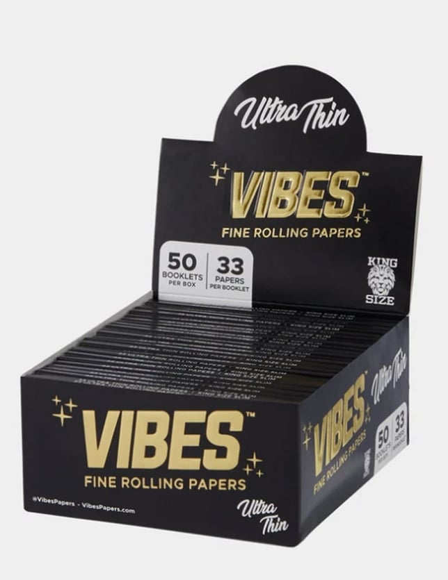 Always be prepared for your next session with the Vibes Rolling Papers Box - King Size Slim. King Size Slim papers can hold around 1 gram of material. Each box contains 50 booklets of King Size Slim Vibes papers with 33 papers in each box, giving you 1,650 King Size Slim Vibes Rolling Papers. The King Size Slim Vibes Papers Box is available in Hemp, Rice, or Ultra Thin.