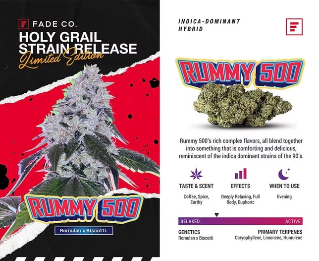 A cross of Romulan and Biscotti, this Indica-leaning hybrid delivers dessert sweetness balanced by subtle spice and heavy gas. The buds are dense and trichome-rich, glowing with purple and green tones beneath a frosty coat. Its aroma blends dough, sugar, and earth for a smooth, bold finish. Fade Co. cultivates this strain to highlight strong flavor and refined presentation.